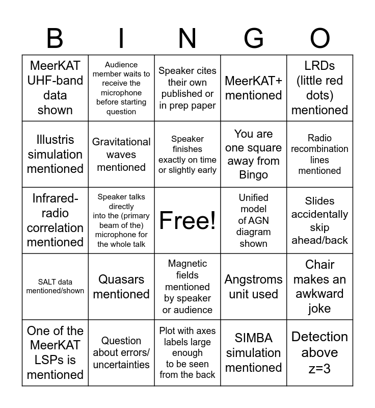 This bingo card has a free space and 35 words: "AGNs" used as plural, Submillimetre data shown, "inspiral", Gravitational waves mentioned, Magnetic fields mentioned by speaker or audience, MeerKAT+ mentioned, Illustris simulation mentioned, Plot of AGN prevalence with time/redshift, Speaker finishes exactly on time or slightly early, BPT diagram shown, Infrared-radio correlation mentioned, LRDs (little red dots) mentioned, Bent-jet radio galaxy shown, Galaxy collisions mentioned, MeerKAT UHF-band data shown, Unified model of AGN diagram shown, SIMBA simulation mentioned, Speaker talks directly into the (primary beam of the) microphone for the whole talk, SALT data mentioned/shown, Detection above z=3, Angstroms unit used, One of the MeerKAT LSPs is mentioned, Chair makes an awkward joke, Question about errors/ uncertainties, Speaker cites their own published or in prep paper, Radio recombination lines mentioned, Speaker has more than two supervisors, Chair adjusts microphone for speaker, You are one square away from Bingo, Slides accidentally skip ahead/back, Equipartition mentioned, Plot with axes labels large enough to be seen from the back, Quasars mentioned, Audience member waits to receive the microphone before starting question and Chair says there's time for "One more quick question".