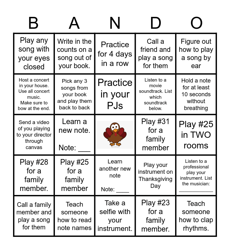 This bingo card has a free space and 24 words: Play #25 for a family member, Teach someone how to read note names, Practice in your PJs, Call a family member and play a song for them, Figure out how to play a song by ear, Play any song with your eyes closed, Host a concert in your house. Use all concert music. Make sure to bow at the end., Write in the counts on a song out of your book., Play #31 for a family member, Learn another new note Note: ____, Listen to a movie soundtrack. List which soundtrack below., Send a video of you playing to your director through canvas, Play your instrument on Thanksgiving Day, Listen to a professional play your instrument. List the musician: _____________, Pick any 3 songs from your book and play them back to back, Play #23 for a family member., Play #25 in TWO rooms, Practice for 4 days in a row, Hold a note for at least 10 seconds without breathing, Learn a new note. Note: ___, Teach someone how to clap rhythms., Play #28 for a family member., Call a friend and play a song for them and Take a selfie with your instrument..