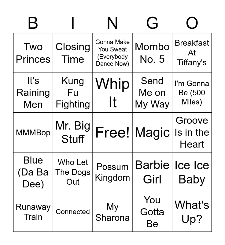This bingo card has a free space and 50 words: Take on Me, What's Up?, Bad Day, My Sharona, Who Let The Dogs Out, Hey Mickey, Closing Time, Hooked on a Feeling, It's Raining Men, 867-5309/Jenny, Kung Fu Fighting, Mombo No. 5, Ice Ice Baby, Barbie Girl, Wipe Out, Got To Be Real, Whip It, Magic, In the Summertime, Breakfast At Tiffany's, Mr. Big Stuff, You Gotta Be, Two Princes, Send Me on My Way, Walking in Memphis, Here Comes the Hotstepper, I'm Gonna Be (500 Miles), Torn, Gonna Make You Sweat (Everybody Dance Now), Possum Kingdom, Kiss Me, One Headlight, More Than Words, Return of the Mack, Connected, Jump Around, What Is Love, No Rain, Whoomp! There It Is, Groove Is in the Heart, Tubthumping, There She Goes, The Sign, Lovefool, Runaway Train, MMMBop, She's so High, I'll Be There for You, Blue (Da Ba Dee) and I Try.
