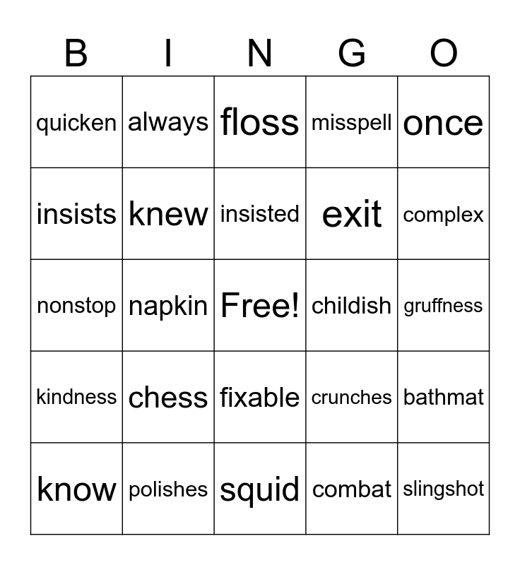 This bingo card has a free space and 34 words: upset, combat, thankful, panic, kindness, knew, once, know, always, often, insisted, floss, invented, dentist, childish, complex, polishes, nonstop, chess, crunches, fixable, mascots, quicken, gruffness, squid, slingshot, misspell, edit, exit, insists, cabin, napkin, bathmat and splendid.