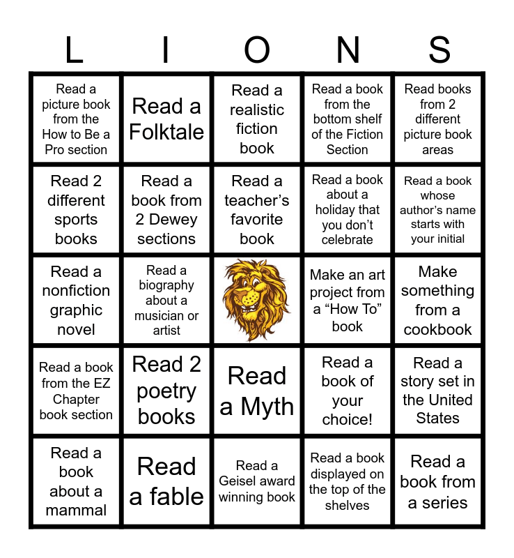 This bingo card has a free space and 24 words: Read 2 poetry books, Read a fable, Read a teacher’s favorite book, Read a book about a mammal, Read books from 2 different picture book areas, Read a picture book from the How to Be a Pro section, Read 2 different sports books, Read a Folktale, Make an art project from a “How To” book, Read a Myth, Read a book about a holiday that you don’t celebrate, Read a nonfiction graphic novel, Read a book of your choice!, Read a story set in the United States, Read a book from 2 Dewey sections, Read a book displayed on the top of the shelves, Make something from a cookbook, Read a realistic fiction book, Read a book whose author’s name starts with your initial, Read a biography about a musician or artist, Read a book from a series, Read a book from the EZ Chapter book section, Read a book from the bottom shelf of the Fiction Section and Read a Geisel award winning book.