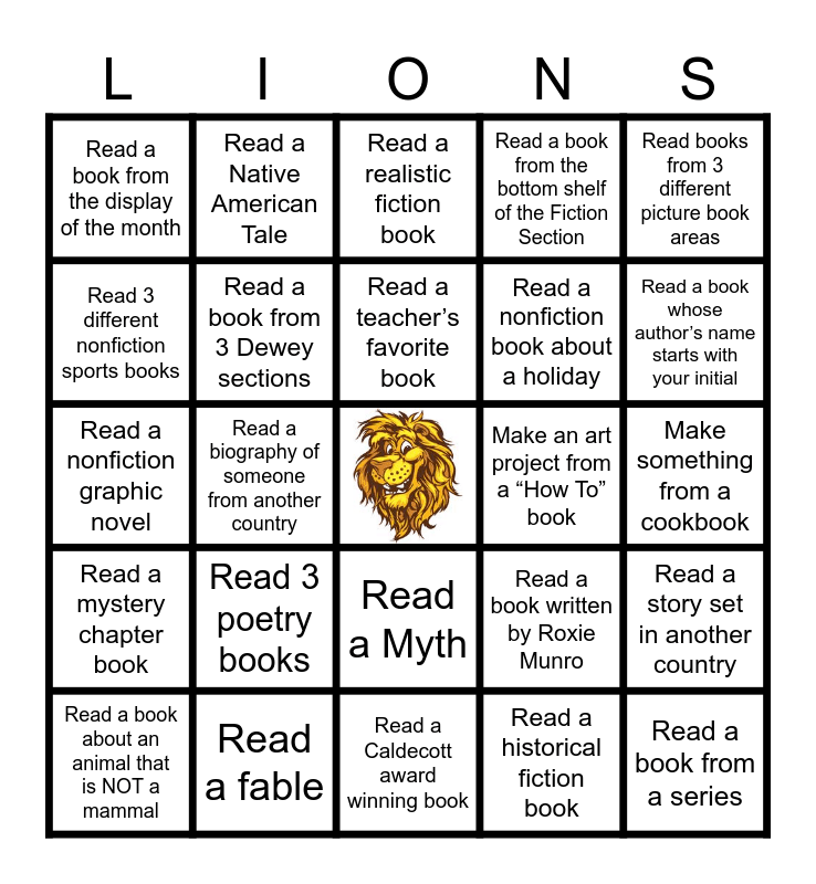 This bingo card has a free space and 24 words: Read 3 poetry books, Read a fable, Read a teacher’s favorite book, Read a book about an animal that is NOT a mammal, Read books from 3 different picture book areas, Read a book from the display of the month, Read 3 different nonfiction sports books, Read a Native American Tale, Make an art project from a “How To” book, Read a Myth, Read a nonfiction book about a holiday, Read a nonfiction graphic novel, Read a book written by Roxie Munro, Read a story set in another country, Read a book from 3 Dewey sections, Read a historical fiction book, Make something from a cookbook, Read a realistic fiction book, Read a book whose author’s name starts with your initial, Read a biography of someone from another country, Read a book from a series, Read a mystery chapter book, Read a book from the bottom shelf of the Fiction Section and Read a Caldecott award winning book.