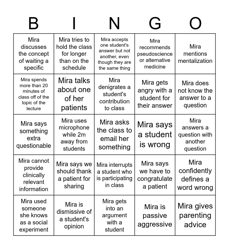 This bingo card has a free space and 34 words: Mira's phone rings, Mira is passive aggressive, Mira labels her patient (psychotic, etc), Mira goes off on a tangent, Mira cannot provide clinically relevant information, Mira talks about one of her patients, Mira mentions mentalization, Mira used someone she knows as a social experiment, Mira tries to hold the class for longer than on the schedule, Mira is patronizing, Mira denigrates a student's contribution to class, Mira accepts one student's answer but not another, even though they are the same thing, Mira shows up 5 minutes late to class, Mira covertly tries to note down who is participating in class, Mira says a student is wrong, Mira does not know the answer to a question, Mira is dismissive of a student's opinion, Mira says something extra questionable, Mira says we should thank a patient for sharing, Mira says we have to congratulate a patient, Mira interrupts a student who is participating in class, Mira asks students why they are laughing in class, Mira discusses the concept of waiting a specific, Mira answers a question with another question, Mira gets into an argument with a student, Mira gives parenting advice, Mira recommends pseudoscience or alternative medicine, Mira sits far too close to a person, Mira gets angry with a student for their answer, Mira spends more than 20 minutes of class off of the topic of the lecture, Mira does not check the homework she assigned last class, Mira uses microphone while 2m away from students, Mira confidently defines a word wrong and Mira gets angry at student for answering question "wrong".