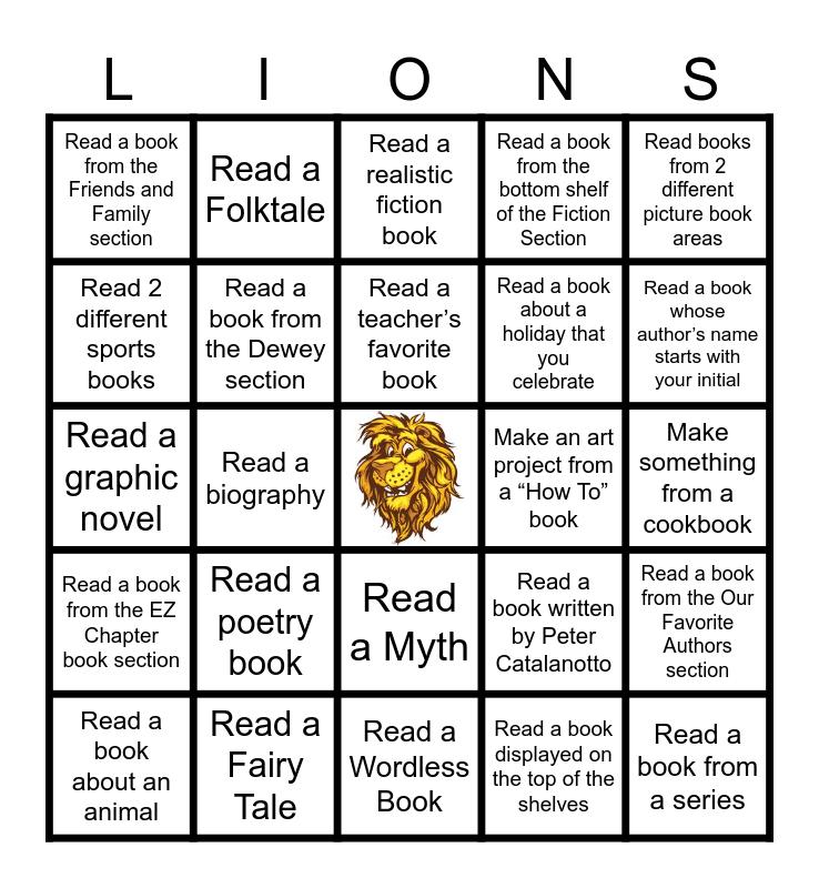 This bingo card has a free space and 24 words: Read a poetry book, Read a Fairy Tale, Read a teacher’s favorite book, Read a book about an animal, Read books from 2 different picture book areas, Read a book from the Friends and Family section, Read 2 different sports books, Read a Folktale, Make an art project from a “How To” book, Read a Myth, Read a book about a holiday that you celebrate, Read a graphic novel, Read a book written by Peter Catalanotto, Read a book from the Our Favorite Authors section, Read a book from the Dewey section, Read a book displayed on the top of the shelves, Make something from a cookbook, Read a realistic fiction book, Read a book whose author’s name starts with your initial, Read a biography, Read a book from a series, Read a book from the EZ Chapter book section, Read a book from the bottom shelf of the Fiction Section and Read a Wordless Book.