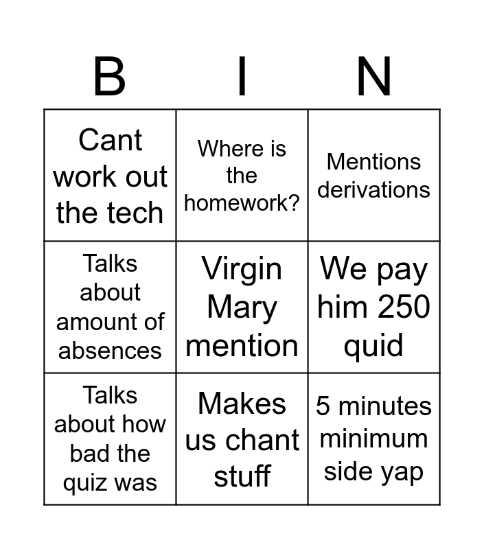 This bingo card has a free space and 8 words: We pay him 250 quid, Mentions derivations, Where is the homework?, Talks about how bad the quiz was, Cant work out the tech, 5 minutes minimum side yap, Talks about amount of absences and Makes us chant stuff.