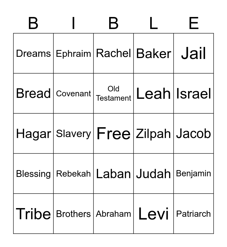 This bingo card has a free space and 69 words: Joseph, Jacob, Egypt, Pharaoh, Brothers, Potiphar, Baker, Cup Bearer, Jail, Famine, Benjamin, Bilhah, Dreams, Rachel, Coat of many colors, Slavery, Laban, Leah, Wine, Blessing, Zilpah, Judah, Israel, Simeon, Bethel, Birthright, 12, Handmaid, Levi, Manasseh, Ephraim, Dan, Naphtali, Gad, Asher, Reuben, Issachar, Zebulun, Bread, Isaac, Rebekah, Patriarch, Esau, Shepherd, Twins, Tribe, Concubine, Ladder to Heaven, "Wrestles with God", Covenant, Old Testament, Genesis, "Beginning", Abraham, Sarah, "Laughter", Ur, Canaan, Haran, Hagar, Ishmael, Judaism, Islam, "Princess", Descendants, A promised Land, Potiphar's Wife, Governor and Interpret.