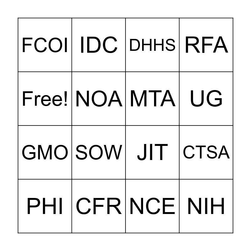 This bingo card has 16 words: CFR, CTSA, DHHS, FCOI, GMO, IDC, JIT, NCE, Free!, NOA, PHI, RFA, SOW, UG, MTA and NIH.