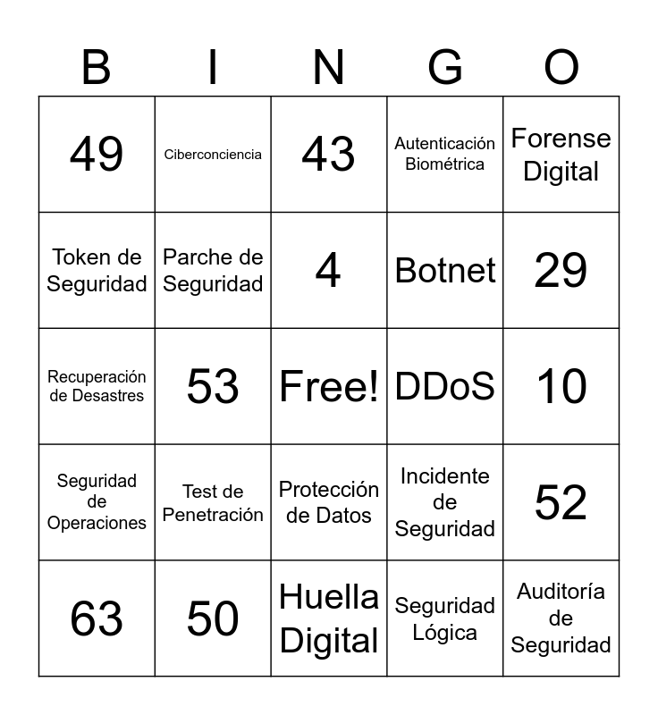 This bingo card has a free space and 150 words: Firewall, Encriptación, Malware, Phishing, VPN, Certificado SSL, Gestor de Contraseñas, Autenticación de Dos Factores, Antivirus, Ciberataque, Ransomware, Fuga de Datos, Botnet, Web Oscura, Parche de Seguridad, Seguridad de Red, Respuesta a Incidentes, Inteligencia de Amenazas, Ingeniería Social, Codificación Segura, Hacking Ético, Análisis de Vulnerabilidades, Ciberdefensa, Ciberespionaje, Criptografía, Seguridad de la Información, Ataque de Fuerza Bruta, DDoS, Exploit, Seguridad Física, Seguridad Lógica, Ciberdelito, Seguridad Perimetral, Amenaza Persistente Avanzada, Seguridad de Aplicaciones, Backup, Seguridad en la Nube, Control de Acceso, Auditoría de Seguridad, BYOD, Cifrado de Datos, Seguridad de Endpoint, Forense Digital, Gobernanza de TI, IDS, IPS, Keylogger, Mitigación de Riesgos, Seguridad de Operaciones, Penetración de Red, Política de Seguridad, Protección de Datos, Recuperación de Desastres, Red Tor, Rootkit, Sandbox, Scam, Seguridad de Servidores, SIM Swapping, Spoofing, Spyware, Test de Penetración, Token de Seguridad, Troyano, Zero Day, Autenticación Biométrica, Ciberconciencia, Ciberseguro, Firma Digital, Huella Digital, Incidente de Seguridad, Monitoreo de Red, Seguridad de Base de Datos, Seguridad Móvil, Vulnerabilidad, 1, 2, 3, 4, 5, 6, 7, 8, 9, 10, 11, 12, 13, 14, 15, 16, 17, 18, 19, 20, 21, 22, 23, 24, 25, 26, 27, 28, 29, 30, 31, 32, 33, 34, 35, 36, 37, 38, 39, 40, 41, 42, 43, 44, 45, 46, 47, 48, 49, 50, 51, 52, 53, 54, 55, 56, 57, 58, 59, 60, 61, 62, 63, 64, 65, 66, 67, 68, 69, 70, 71, 72, 73, 74 and 75.