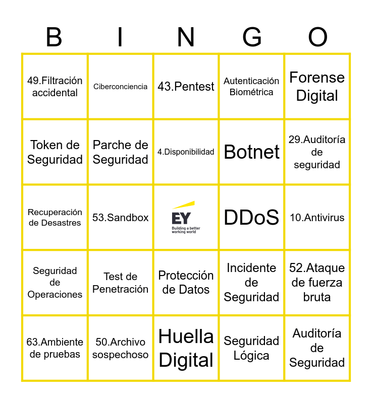 This bingo card has a free space and 150 words: Firewall, Encriptación, Malware, Phishing, VPN, Certificado SSL, Gestor de Contraseñas, Autenticación de Dos Factores, Antivirus, Ciberataque, Ransomware, Fuga de Datos, Botnet, Web Oscura, Parche de Seguridad, Seguridad de Red, Respuesta a Incidentes, Inteligencia de Amenazas, Ingeniería Social, Codificación Segura, Hacking Ético, Análisis de Vulnerabilidades, Ciberdefensa, Ciberespionaje, Criptografía, Seguridad de la Información, Ataque de Fuerza Bruta, DDoS, Exploit, Seguridad Física, Seguridad Lógica, Ciberdelito, Seguridad Perimetral, Amenaza Persistente Avanzada, Seguridad de Aplicaciones, Backup, Seguridad en la Nube, Control de Acceso, Auditoría de Seguridad, BYOD, Cifrado de Datos, Seguridad de Endpoint, Forense Digital, Gobernanza de TI, IDS, IPS, Keylogger, Mitigación de Riesgos, Seguridad de Operaciones, Penetración de Red, Política de Seguridad, Protección de Datos, Recuperación de Desastres, Red Tor, Rootkit, Sandbox, Scam, Seguridad de Servidores, SIM Swapping, Spoofing, Spyware, Test de Penetración, Token de Seguridad, Troyano, Zero Day, Autenticación Biométrica, Ciberconciencia, Ciberseguro, Firma Digital, Huella Digital, Incidente de Seguridad, Monitoreo de Red, Seguridad de Base de Datos, Seguridad Móvil, Vulnerabilidad, 1.Seguridad de la Información, 2.Confidencialidad, 3.Integridad, 4.Disponibilidad, 5.Dato personal, 6.Dato sensible, 7.Vishing, 8.Malware, 9.Ransomware, 10.Antivirus, 11.Ciberseguridad, 12.Ingeniería social, 13.Contraseña segura, 14.Doble Factor de utenticación (2FA), 15.Incidente de seguridad, 16.Brecha de datos, 17.Cifrado, 18.VPN, 19.Firewall, 20.Respaldo (backup), 21.Principio de mínimo privilegio, 22.Gestión de accesos, 23.Activo de información, 24.Política de seguridad, 25.Suplantación de identidad, 26.Spear phishing, 27.Parche de seguridad, 28.Log, 29.Auditoría de seguridad, 30.ISO 27001, 31.Anonimización, 32.Fuga de información, 33.Ataque DDoS, 34.Contraseña temporal, 35.Autenticación, 36.Autorización, 37.Token de seguridad, 38.Política de escritorio limpio, 39.Acceso no autorizado, 40.Correo malicioso, 41.Ingeniería inversa, 42.SOC, 43.Pentest, 44.Vulnerabilidad, 45.Exploit, 46.Metadatos, 47.Politicas, 48.USB seguro, 49.Filtración accidental, 50.Archivo sospechoso, 51.Potección de endpoint, 52.Ataque de fuerza bruta, 53.Sandbox, 54.Hashing, 55.Cookie, 56.Acuerdo de confidencialidad, 57.Data Protection Officer (DPO), 58.Ataque Man-in-the-Middle (MITM), 59.Rol de usuario, 60.Política de contraseñas, 61.Phishing, 62.Acceso privilegiado, 63.Ambiente de pruebas, 64.Incidente de malware, 65.Trazabilidad, 66.Capacitación, 67.Segregación de funciones, 68.Ciclo de vida de la información, 69.Archivo cifrado, 70.Alerta de seguridad, 71.Monitoreo continuo, 72.Actualización crítica, 73.Fuga por ingeniería social, 74.Gestor de contraseñas and 75.Autenticación biométrica.