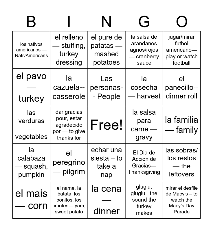 This bingo card has a free space and 27 words: El Dia de Accion de Gracias— Thanksgiving, La comida -- Food, la cosecha — harvest, la cena— dinner, el pavo— turkey, el pure de patatas — mashed potatoes, el relleno— stuffing, turkey dressing, la calabaza — squash, pumpkin, la salsa para carne — gravy, las sobras/ los restos — the leftovers, las verduras — vegetables, la salsa de arandanos agrios/rojos— cranberry sauce, el mais — corn, el name, la batata, los bonitos, los cmotes— yam, sweet potato, el panecillo--dinner roll, el pastel (o la tarta) de calabaza— pumpkin pie, la cazuela-- casserole, Las personas-- People, el peregrino— pilgrim, los nativos americanos — NativAmericans, la familia — family, gluglu, gluglu– the sound the turkey makes, dar gracias pour, estar agradecido por — to give thanks for, mirar el desfile de Macy’s – to watch the Macy’s Day Parade, echar una siesta – to take a nap, jugar/mirar futbol americano— play or watch football and dar un paseo– to go for a walk.