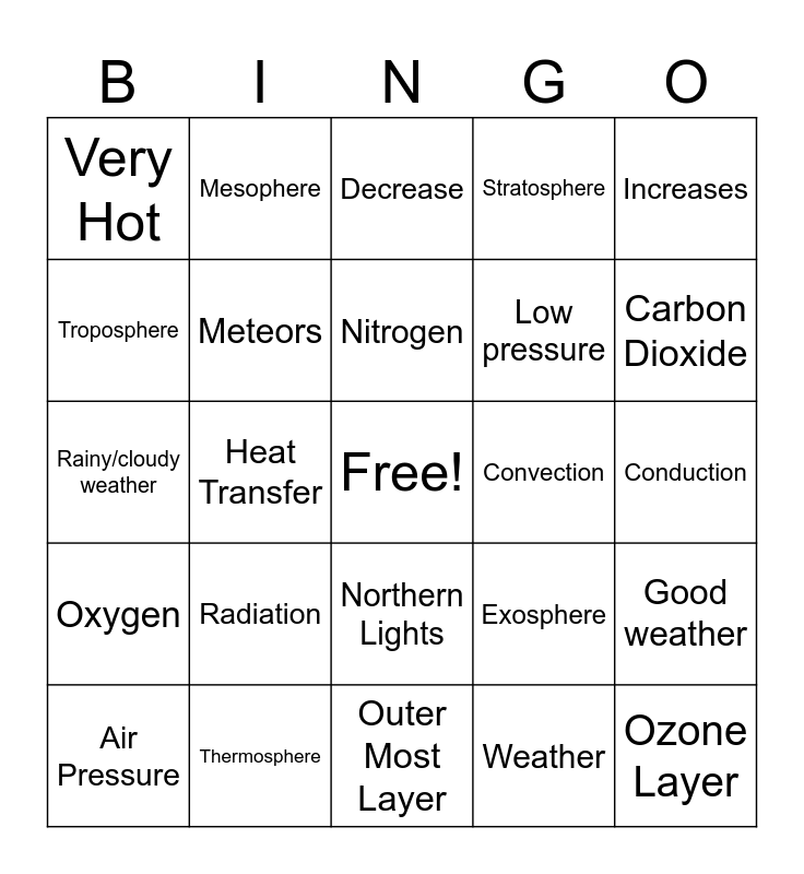 This bingo card has a free space and 24 words: Radiation, Thermosphere, Nitrogen, Air Pressure, Increases, Very Hot, Troposphere, Mesophere, Convection, Northern Lights, Low pressure, Rainy/cloudy weather, Exosphere, Good weather, Meteors, Weather, Conduction, Decrease, Carbon Dioxide, Heat Transfer, Ozone Layer, Oxygen, Stratosphere and Outer Most Layer.