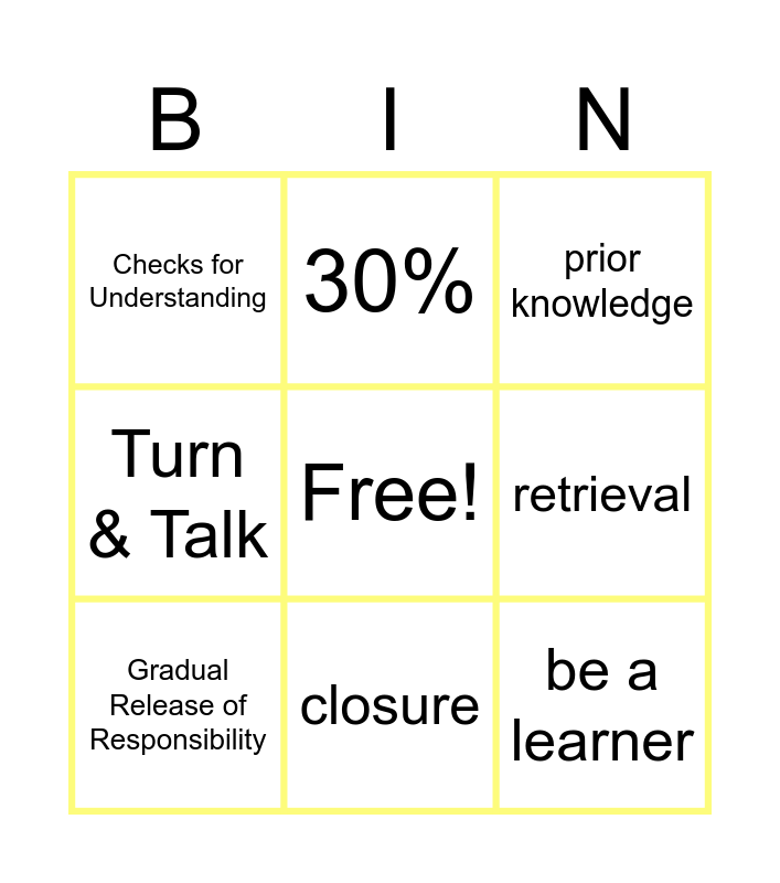 This bingo card has a free space and 8 words: retrieval, prior knowledge, 30%, Gradual Release of Responsibility, Checks for Understanding, be a learner, Turn & Talk and closure.