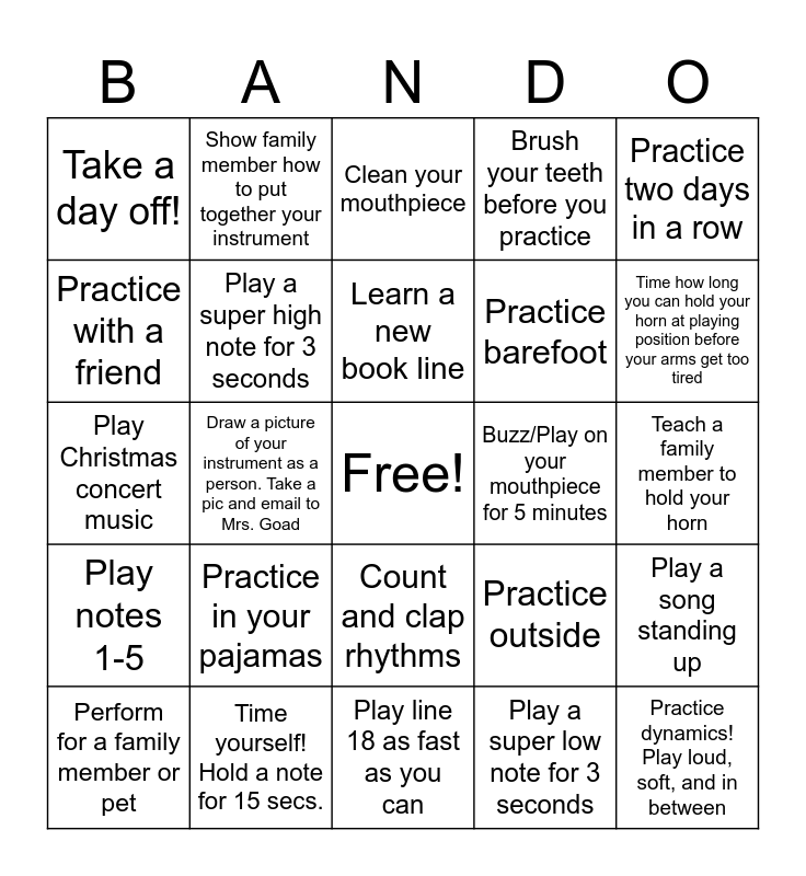 This bingo card has a free space and 24 words: Practice in your pajamas, Time yourself! Hold a note for 15 secs., Learn a new book line, Perform for a family member or pet, Practice two days in a row, Take a day off!, Practice with a friend, Show family member how to put together your instrument, Buzz/Play on your mouthpiece for 5 minutes, Count and clap rhythms, Practice barefoot, Play Christmas concert music, Practice outside, Play a song standing up, Play a super high note for 3 seconds, Play a super low note for 3 seconds, Teach a family member to hold your horn, Clean your mouthpiece, Time how long you can hold your horn at playing position before your arms get too tired, Draw a picture of your instrument as a person. Take a pic and email to Mrs. Goad, Practice dynamics! Play loud, soft, and in between, Play notes 1-5, Brush your teeth before you practice and Play line 18 as fast as you can.