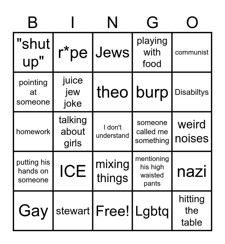 This bingo card has 25 words: putting his hands on someone, stewart, I don't understand, Lgbtq, communist, "shut up", r*pe, Jews, someone called me something, nazi, pointing at someone, juice jew joke, Free!, mentioning his high waisted pants, Disabiltys, Gay, talking about girls, theo, burp, weird noises, homework, ICE, mixing things, playing with food and hitting the table.