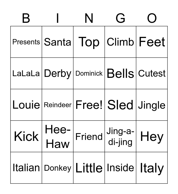 This bingo card has a free space and 24 words: Hee-Haw, Donkey, Dominick, Italian, Feet, Presents, LaLaLa, Santa, Sled, Friend, Bells, Louie, Jing-a-di-jing, Hey, Derby, Inside, Jingle, Top, Cutest, Reindeer, Italy, Kick, Climb and Little.