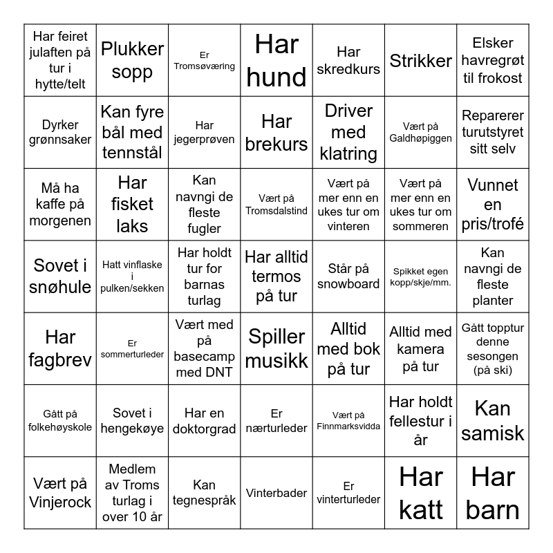 This bingo card has a free space and 48 words: Vært på Finnmarksvidda, Vært på Galdhøpiggen, Vinterbader, Hatt vinflaske i pulken/sekken, Kan navngi de fleste fugler, Kan navngi de fleste planter, Plukker sopp, Medlem av Troms turlag i over 10 år, Strikker, Spiller musikk, Elsker havregrøt til frokost, Har hund, Vært på mer enn en ukes tur om sommeren, Vært på mer enn en ukes tur om vinteren, Gått på folkehøyskole, Spikket egen kopp/skje/mm., Dyrker grønnsaker, Reparerer turutstyret sitt selv, Har holdt fellestur i år, Har skredkurs, Driver med klatring, Har holdt tur for barnas turlag, Har feiret julaften på tur i hytte/telt, Kan fyre bål med tennstål, Kan samisk, Har jegerprøven, Vunnet en pris/trofé, Vært på Vinjerock, Vært på Tromsdalstind, Har fisket laks, Har katt, Står på snowboard, Gått topptur denne sesongen (på ski), Sovet i hengekøye, Sovet i snøhule, Alltid med bok på tur, Alltid med kamera på tur, Må ha kaffe på morgenen, Vært med på basecamp med DNT, Har en doktorgrad, Har fagbrev, Har barn, Er Tromsøværing, Kan tegnespråk, Har brekurs, Er nærturleder, Er sommerturleder and Er vinterturleder.