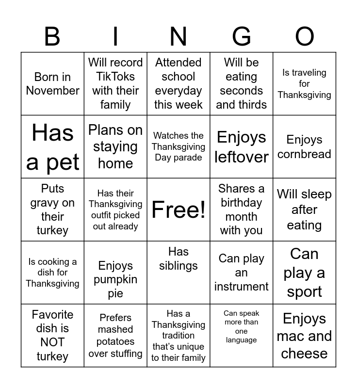 This bingo card has a free space and 24 words: Enjoys pumpkin pie, Prefers mashed potatoes over stuffing, Watches the Thanksgiving Day parade, Favorite dish is NOT turkey, Is traveling for Thanksgiving, Born in November, Has a pet, Will record TikToks with their family, Shares a birthday month with you, Has siblings, Enjoys leftover, Puts gravy on their turkey, Can play an instrument, Can play a sport, Plans on staying home, Can speak more than one language, Will sleep after eating, Attended school everyday this week, Enjoys cornbread, Has their Thanksgiving outfit picked out already, Enjoys mac and cheese, Is cooking a dish for Thanksgiving, Will be eating seconds and thirds and Has a Thanksgiving tradition that’s unique to their family.