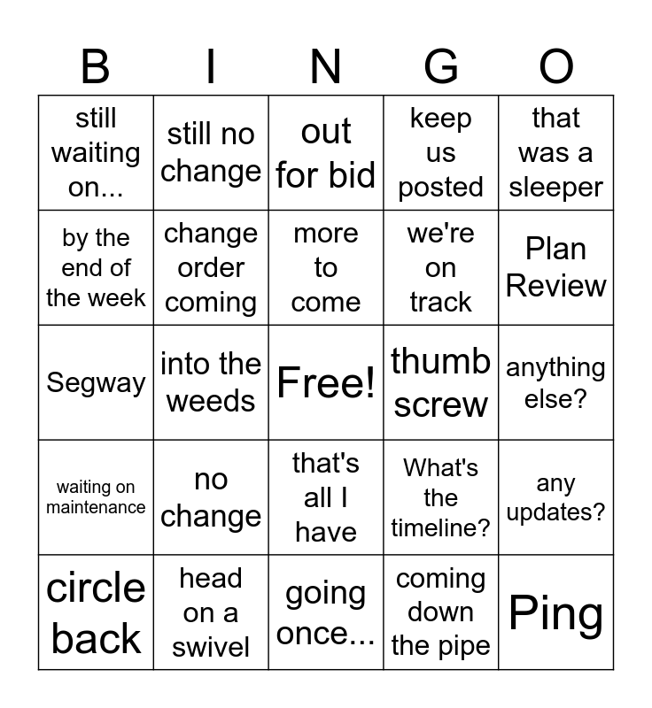 This bingo card has a free space and 27 words: What's the timeline?, Bryan Romney, we're on track, going once..., by the end of the week, out for bid, still no change, waiting on maintenance, thumb screw, any updates?, Segway, keep us posted, circle back, head on a swivel, Plan Review, ...by next week, change order coming, more to come, no change, still waiting on..., anything else?, coming down the pipe, into the weeds, Ping, that's all I have, that was a sleeper and free soda.