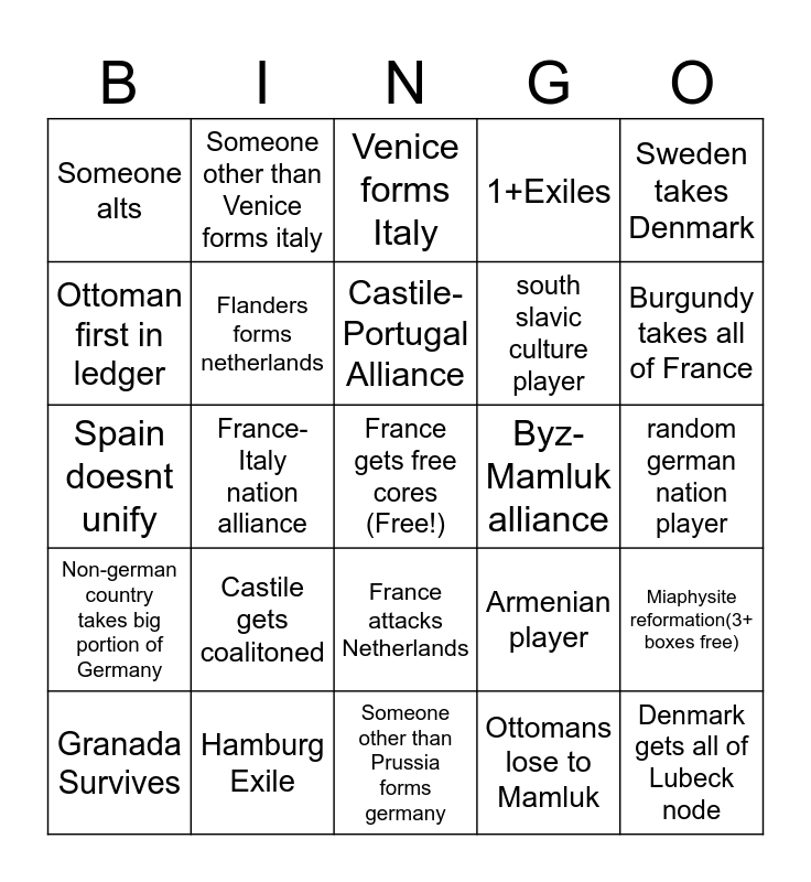 This bingo card has a free space and 34 words: Devwiper, Ottomans lose to Mamluk, Novgorod Unifies Russia, Super toxic guy, Non-german country takes big portion of Germany, Flanders forms netherlands, Sweden takes Denmark, Granada Survives, Someone other than Venice forms italy, Byzantium Survives, Castile-Portugal Alliance, Venice forms Italy, Qara qoyunlu player, Muscovy Unifies Russia, Byz-Mamluk alliance, Burgundy takes all of France, Hamburg Exile, Spain doesnt unify, Castile gets coalitoned, Armenian player, France attacks Netherlands, France gets coalitoned, Someone alts, random german nation player, Someone other than Prussia forms germany, Denmark gets all of Lubeck node, 1+Exiles, England takes all of France, south slavic culture player, Ottoman first in ledger, Italy nation first in ledger, France-Italy nation alliance, Miaphysite reformation(3+ boxes free) and No horde player.