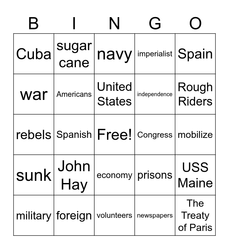 This bingo card has a free space and 24 words: John Hay, foreign, United States, military, Spain, Cuba, war, sugar cane, Congress, economy, independence, rebels, prisons, USS Maine, Americans, newspapers, mobilize, navy, Rough Riders, Spanish, The Treaty of Paris, sunk, imperialist and volunteers.