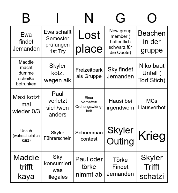 This bingo card has 25 words: Skyler Führerschein, Paul oder törke nimmt ab, Freizeitpark als Gruppe, Maddie trifft kaya, Beachen in der gruppe, Ewa findet Jemanden, Maddie macht dumme scheiße betrunken, Ewa schafft Semester prüfungen 1st Try, Hausi bei irgendwem, Schneeman contest, Sky findet Jemanden, Maxi kotzt mal wieder 0/3, Skyler Outing, Krieg, Skyler kotzt wegen alk, Skyler Trifft schatzi, MCs Hausverbot, Lost place, Niko baut Unfall ( Torf Stich), Paul verletzt sich/wen anders, Einer Verhaftet/ Ordnungswidrig-keit, Sky konsumiert was illegales, Urlaub (wahrscheinlich kurz), New group member ( hoffentlich schwarz für die Quote) and Törke Findet Jemanden.