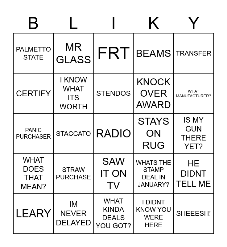 This bingo card has a free space and 24 words: STRAW PURCHASE, IM NEVER DELAYED, STENDOS, LEARY, TRANSFER, PALMETTO STATE, CERTIFY, MR GLASS, STAYS ON RUG, SAW IT ON TV, KNOCK OVER AWARD, PANIC PURCHASER, WHATS THE STAMP DEAL IN JANUARY?, HE DIDNT TELL ME, I KNOW WHAT ITS WORTH, I DIDNT KNOW YOU WERE HERE, IS MY GUN THERE YET?, FRT, WHAT MANUFACTURER?, STACCATO, SHEEESH!, WHAT DOES THAT MEAN?, BEAMS and WHAT KINDA DEALS YOU GOT?.