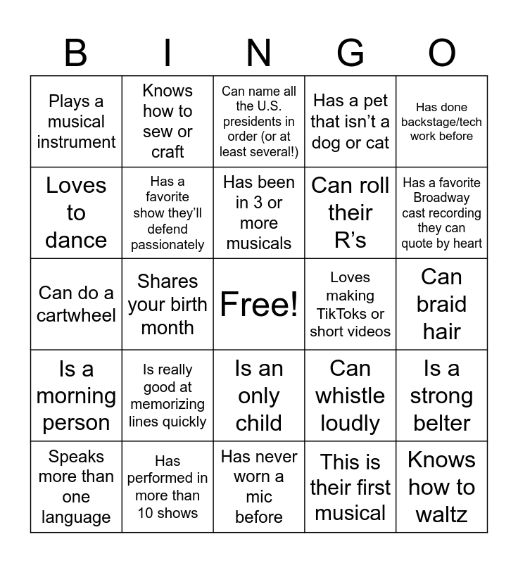 This bingo card has a free space and 26 words: Is an only child, This is their first musical, Has been in 3 or more musicals, Has performed in more than 10 shows, Has done backstage/tech work before, Plays a musical instrument, Loves to dance, Knows how to sew or craft, Can braid hair, Can whistle loudly, Can roll their R’s, Can do a cartwheel, Is a strong belter, Speaks more than one language, Shares your birth month, Has traveled outside the country, Has a pet that isn’t a dog or cat, Is a morning person, Can name all the U.S. presidents in order (or at least several!), Knows how to waltz, Has a favorite Broadway cast recording they can quote by heart, Has never worn a mic before, Loves making TikToks or short videos, Is really good at memorizing lines quickly, Has a favorite show they’ll defend passionately and Has met or seen a Broadway performer in person.