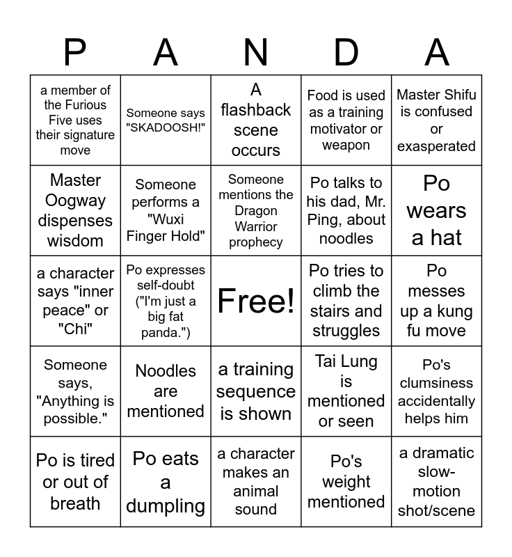 This bingo card has a free space and 24 words: Noodles are mentioned, Po eats a dumpling, Someone mentions the Dragon Warrior prophecy, Po is tired or out of breath, Master Shifu is confused or exasperated, a member of the Furious Five uses their signature move, Master Oogway dispenses wisdom, Someone says "SKADOOSH!", Po tries to climb the stairs and struggles, a training sequence is shown, Po talks to his dad, Mr. Ping, about noodles, a character says "inner peace" or "Chi", Tai Lung is mentioned or seen, Po's clumsiness accidentally helps him, Someone performs a "Wuxi Finger Hold", Po's weight mentioned, Po messes up a kung fu move, A flashback scene occurs, Po wears a hat, Po expresses self-doubt ("I'm just a big fat panda."), a dramatic slow-motion shot/scene, Someone says, "Anything is possible.", Food is used as a training motivator or weapon and a character makes an animal sound.