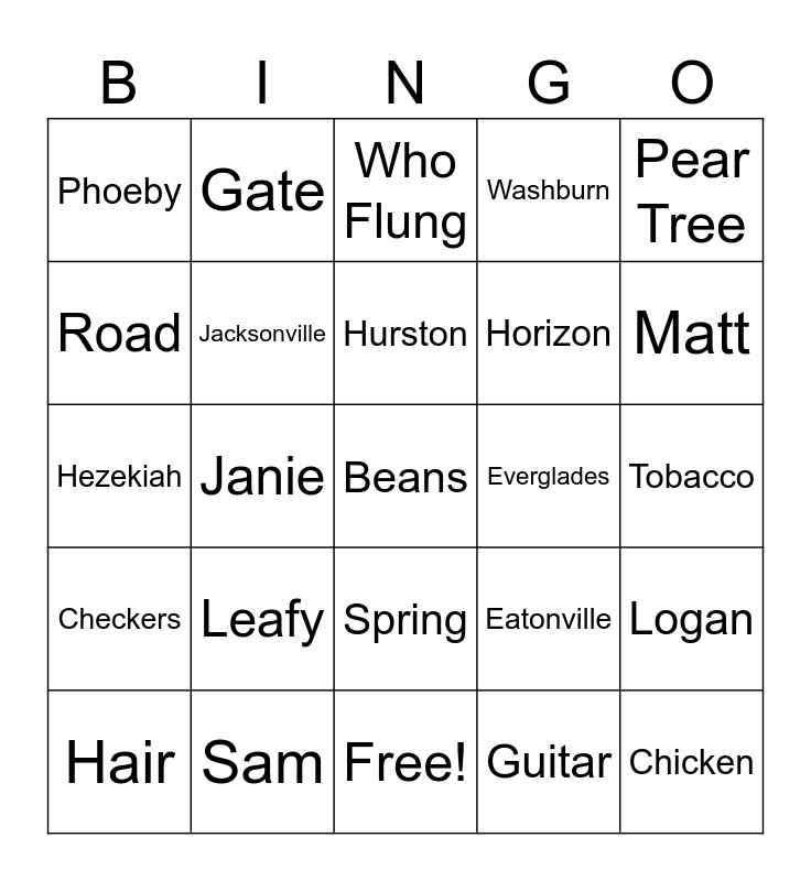 This bingo card has 31 words: Free!, Tea Cake, Janie, Jody, Phoeby, Who Flung, Jacksonville, Eatonville, Everglades, Guitar, Tobacco, Beans, Chicken, Pork, Matt, Nanny, Logan, Leafy, Checkers, Spring, Pear Tree, Rain, Hair, Gate, Horizon, Road, Washburn, Hezekiah, Sam, Hurston and Lincoln.