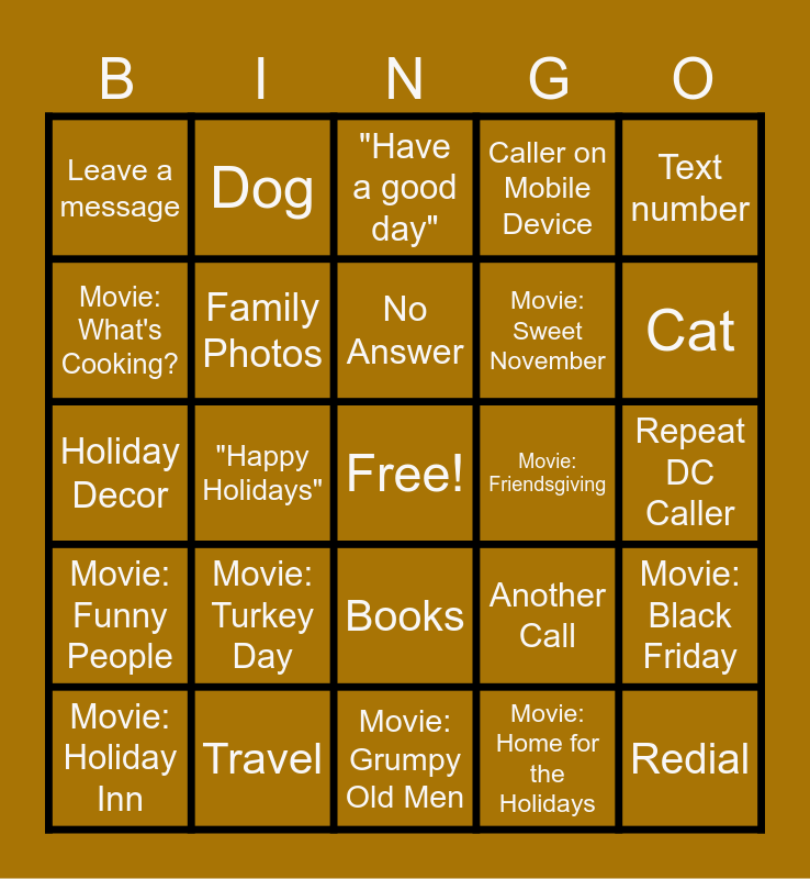 This bingo card has a free space and 24 words: Movie: Turkey Day, Travel, No Answer, Movie: Holiday Inn, Text number, Leave a message, Movie: What's Cooking?, Dog, Movie: Friendsgiving, Books, Movie: Sweet November, Holiday Decor, Another Call, Movie: Black Friday, Family Photos, Movie: Home for the Holidays, Repeat DC Caller, "Have a good day", Cat, "Happy Holidays", Redial, Movie: Funny People, Caller on Mobile Device and Movie: Grumpy Old Men.