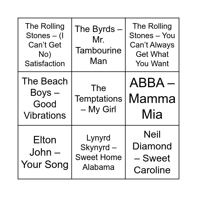 This bingo card has 70 words: The Beatles – Hey Jude, The Beatles – Let It Be, The Beatles – Twist and Shout, The Beatles – I Want to Hold Your Hand, Elvis Presley – Can’t Help Falling in Love, Elvis Presley – Suspicious Minds, The Beach Boys – Good Vibrations, The Beach Boys – Wouldn’t It Be Nice, The Temptations – My Girl, The Supremes – Stop! In the Name of Love, Aretha Franklin – Respect, The Monkees – I’m a Believer, The Rolling Stones – (I Can’t Get No) Satisfaction, The Rolling Stones – You Can’t Always Get What You Want, Ben E. King – Stand by Me, Sam Cooke – Wonderful World, Van Morrison – Brown Eyed Girl, Neil Diamond – Sweet Caroline, Creedence Clearwater Revival – Bad Moon Rising, The Mamas & The Papas – California Dreamin’, The Righteous Brothers – You’ve Lost That Lovin’ Feelin’, The Four Tops – I Can’t Help Myself (Sugar Pie Honey Bunch), The Jackson 5 – I Want You Back, The Isley Brothers – Shout, Dusty Springfield – Son of a Preacher Man, The Foundations – Build Me Up Buttercup, The Archies – Sugar, Sugar, The Turtles – Happy Together, Bob Dylan – Like a Rolling Stone, The Doors – Light My Fire, The Byrds – Mr. Tambourine Man, Simon & Garfunkel – Mrs. Robinson, The Who – My Generation, The Animals – House of the Rising Sun, The Kinks – You Really Got Me, Queen – Bohemian Rhapsody, Queen – We Will Rock You, Queen – We Are the Champions, ABBA – Dancing Queen, ABBA – Mamma Mia, ABBA – Take a Chance on Me, Bee Gees – Stayin’ Alive, Bee Gees – How Deep Is Your Love, Elton John – Rocket Man, Elton John – Tiny Dancer, Elton John – Your Song, Fleetwood Mac – Go Your Own Way, Fleetwood Mac – Dreams, Journey – Lights, Gloria Gaynor – I Will Survive, Billy Joel – Piano Man, Bill Withers – Lean on Me, Bill Withers – Lovely Day, John Denver – Take Me Home, Country Roads, The Eagles – Hotel California, The Eagles – Take It Easy, Lynyrd Skynyrd – Sweet Home Alabama, Don McLean – American Pie, Rod Stewart – Maggie May, Carole King – It’s Too Late, Carpenters – Top of the World, Barry Manilow – Copacabana, KC & The Sunshine Band – Boogie Shoes, The Jackson 5 – ABC, Earth, Wind & Fire – September, The Doobie Brothers – Listen to the Music, The Knack – My Sharona, The Beatles – Let It Be, Paul Simon – Me and Julio Down by the Schoolyard and Village People – Y.M.C.A..