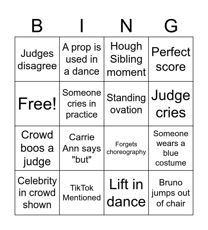 This bingo card has 16 words: TikTok Mentioned, Someone wears a blue costume, Hough Sibling moment, Judges disagree, Crowd boos a judge, A prop is used in a dance, Forgets choreography, Lift in dance, Free!, Someone cries in practice, Celebrity in crowd shown, Perfect score, Carrie Ann says "but", Judge cries, Standing ovation and Bruno jumps out of chair.
