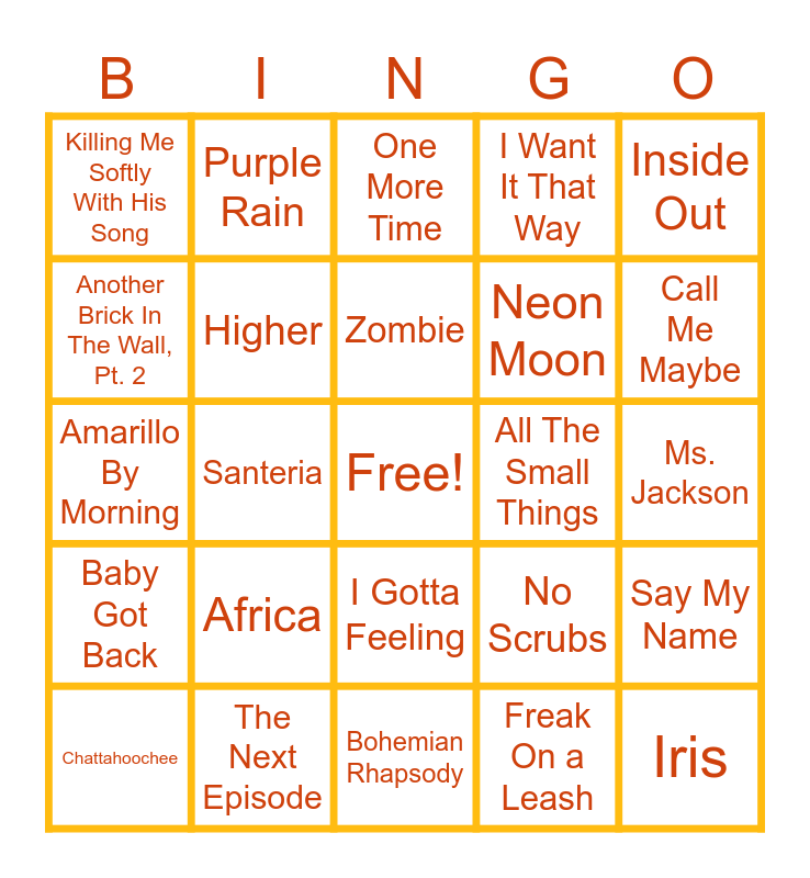 This bingo card has a free space and 50 words: The Reason, Iris, Hotel California, Bohemian Rhapsody, Africa, Smells Like Teen Spirit, Purple Rain, Don't Stop Believin', Another Brick In The Wall, Pt. 2, Rocket Man (I Think It's Going To Be A Long, Long Time), Higher, I Want It That Way, Say My Name, No Scrubs, Oops!...I Did It Again, Wannabe, Zombie, All The Small Things, Losing My Religion, Inside Out, Santeria, Freak On a Leash, Killing Me Softly With His Song, Neon Moon, Low, Bad Romance, Call Me Maybe, In Da Club, One More Time, I Gotta Feeling, Clint Eastwood, In the End, The Real Slim Shady, Give Me Everything, The Next Episode, Under the Bridge, Everlong, I Wanna Dance with Somebody (Who Loves Me), U Got It Bad, Ms. Jackson, We Found Love, Sugar, We're Going Down, Jeremy, Basket Case, Chattahoochee, Amarillo By Morning, Mr. Brightside, Dreams, Baby Got Back and I Write Sins Not Tragedies.