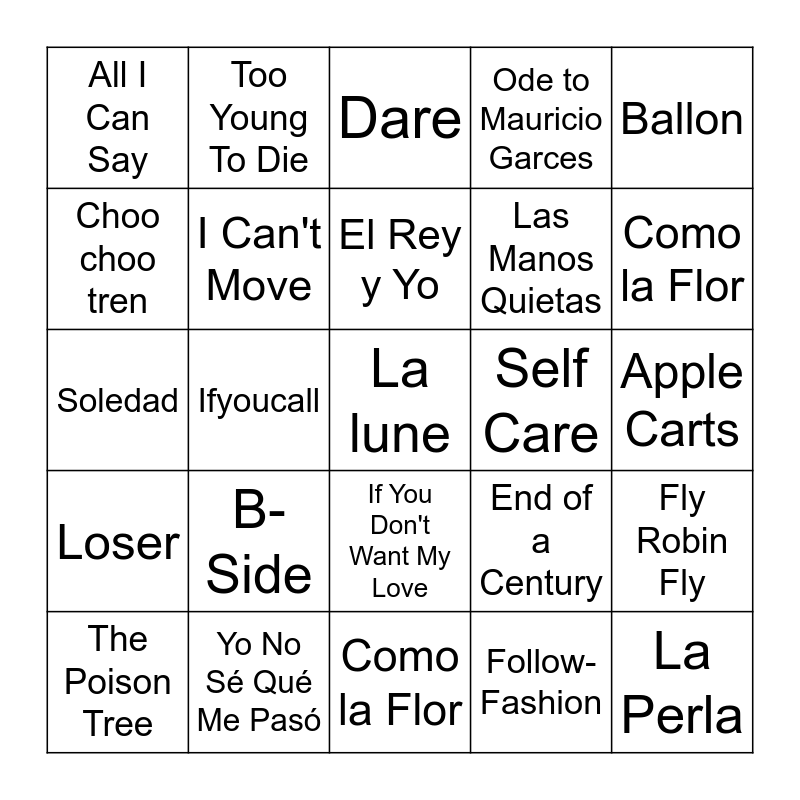 This bingo card has a free space and 24 words: The Poison Tree, B-Side, El Rey y Yo, Follow-Fashion, Ballon, All I Can Say, Too Young To Die, Dare, Self Care, Apple Carts, Soledad, I Can't Move, End of a Century, Fly Robin Fly, Choo choo tren, Yo No Sé Qué Me Pasó, Como la Flor, Ode to Mauricio Garces, Como la Flor, Loser, Ifyoucall, If You Don't Want My Love, Las Manos Quietas and La Perla.