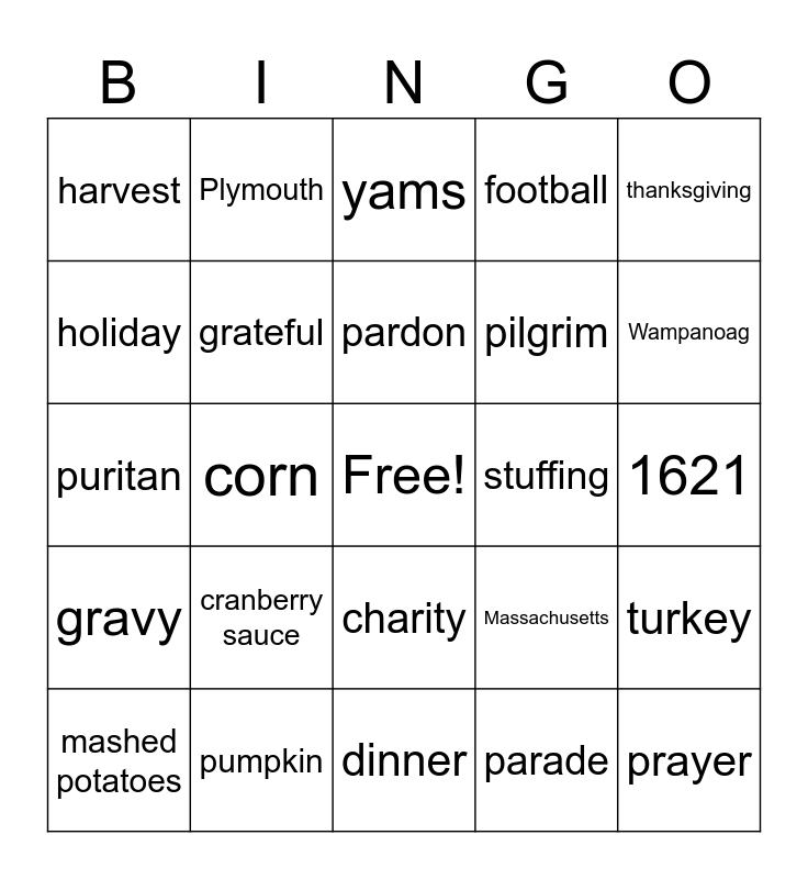 This bingo card has a free space and 26 words: charity, parade, pardon, pumpkin, thanksgiving, harvest, holiday, Plymouth, 1621, Massachusetts, pilgrim, puritan, turkey, mashed potatoes, corn, Thursday, football, gravy, yams, prayer, Wampanoag, dinner, stuffing, cranberry sauce, grateful and together.