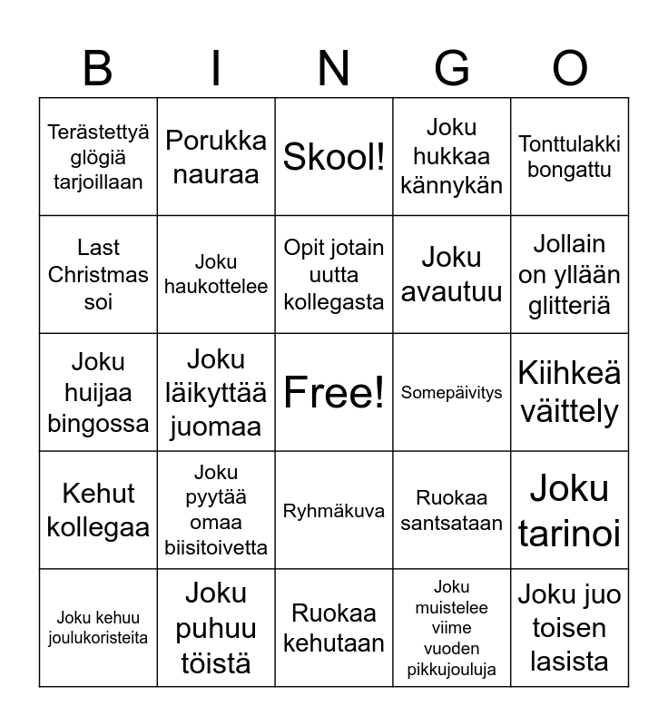 This bingo card has a free space and 29 words: Joku kehuu joulukoristeita, Joku ottaa kuvan ruuasta ennen syömistä, Joku läikyttää juomaa, Jatkot mainittu, Terästettyä glögiä tarjoillaan, Skool!, Joku haukottelee, Joku pyytää omaa biisitoivetta, Somepäivitys, Joku puhuu töistä, Kiihkeä väittely, Joku juo toisen lasista, Ruokaa kehutaan, Joku muistelee viime vuoden pikkujouluja, Jollain on yllään glitteriä, Reikä sukkahousuissa, Ryhmäkuva, Kehut kollegaa, Tonttulakki bongattu, Joku huijaa bingossa, Ruokaa santsataan, Halataan, Joku avautuu, Last Christmas soi, Joku hukkaa kännykän, Porukka nauraa, Joku tarinoi, Opit jotain uutta kollegasta and Joku valittaa kylmästä/pimeästä.