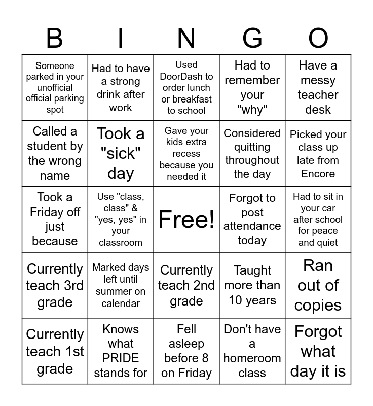 This bingo card has a free space and 49 words: Have been called mom or dad, Forgot what day it is, Left school, but had to come back for something, Fell asleep before 8 on Friday, Marked days left until summer on calendar, Left coffee in microwave, Had to have a strong drink after work, Had more than 2 cups of coffee, Called a student by the wrong name, Made one of your students cry, Took a "sick" day, Had to remember your "why", Ran out of copies, Taught more than 10 years, Taught more than 20 years, Taught an afterschool program, Gave your kids extra recess because you needed it, Forgot to post attendance today, Wanted to take a nap during the day, Have a messy teacher desk, Use "class, class" & "yes, yes" in your classroom, Don't have a homeroom class, Someone parked in your unofficial official parking spot, Considered quitting throughout the day, Finally figured out what "67" means, Picked your class up late from Encore, Currently teach 1st grade, Currently teach Kindergarten, Currently teach 2nd grade, Currently teach 3rd grade, Currently teach 4th grade, Currently teach 5th grade, Is an Encore teacher, Is an IA, Knows what PRIDE stands for, Ate breakfast this morning, Has skipped lunch to finish work, Had to take a day off work because of your personal children, Had to sit in your car after school for peace and quiet, Has a favorite student, Has left school exactly at 3:20 or earlier, Eaten a school lunch, Used AI to create a lesson, Made an anchor chart, Took a Friday off just because, Used DoorDash to order lunch or breakfast to school, Needed some chocolate throughout the day, Have more than 1,000 unread emails and Have more than 5 tabs open on your computer.