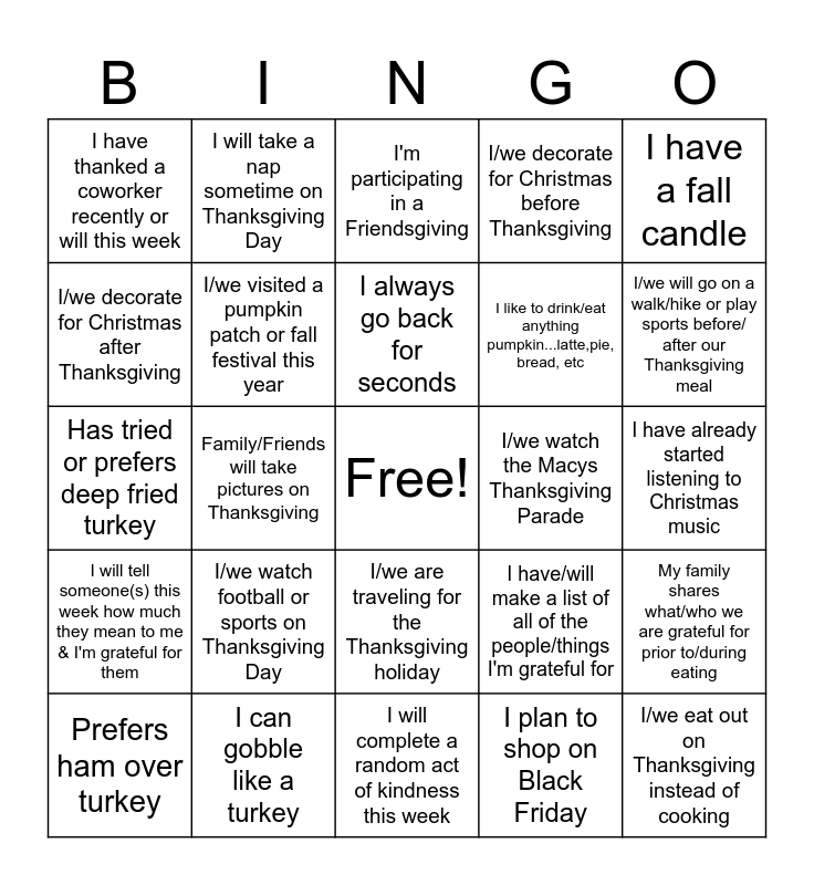 This bingo card has a free space and 24 words: I/we watch football or sports on Thanksgiving Day, I can gobble like a turkey, I always go back for seconds, Prefers ham over turkey, I have a fall candle, I have thanked a coworker recently or will this week, I/we decorate for Christmas after Thanksgiving, I will take a nap sometime on Thanksgiving Day, I/we watch the Macys Thanksgiving Parade, I/we are traveling for the Thanksgiving holiday, I like to drink/eat anything pumpkin...latte,pie, bread, etc, Has tried or prefers deep fried turkey, I have/will make a list of all of the people/things I'm grateful for, My family shares what/who we are grateful for prior to/during eating, I/we visited a pumpkin patch or fall festival this year, I plan to shop on Black Friday, I have already started listening to Christmas music, I'm participating in a Friendsgiving, I/we will go on a walk/hike or play sports before/ after our Thanksgiving meal, Family/Friends will take pictures on Thanksgiving, I/we eat out on Thanksgiving instead of cooking, I will tell someone(s) this week how much they mean to me & I'm grateful for them, I/we decorate for Christmas before Thanksgiving and I will complete a random act of kindness this week.