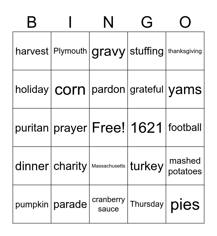 This bingo card has a free space and 24 words: charity, parade, pardon, pumpkin, thanksgiving, harvest, holiday, Plymouth, 1621, Massachusetts, grateful, puritan, turkey, mashed potatoes, corn, Thursday, football, gravy, yams, prayer, pies, dinner, stuffing and cranberry sauce.