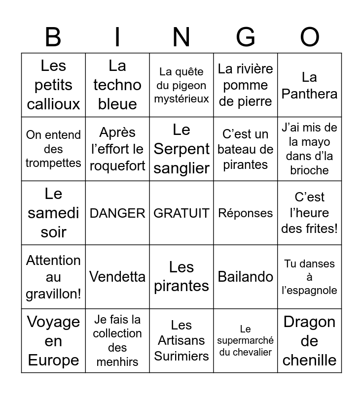 This bingo card has a free space and 24 words: Vendetta, Je fais la collection des menhirs, Le Serpent sanglier, Voyage en Europe, La Panthera, Les petits callioux, On entend des trompettes, La techno bleue, Réponses, Les pirantes, C’est un bateau de pirantes, Le samedi soir, Bailando, Tu danses à l’espagnole, Après l’effort le roquefort, Le supermarché du chevalier, C’est l’heure des frites!, La quête du pigeon mystérieux, J’ai mis de la mayo dans d’la brioche, DANGER, Dragon de chenille, Attention au gravillon!, La rivière pomme de pierre and Les Artisans Surimiers.