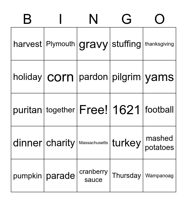 This bingo card has a free space and 24 words: charity, parade, pardon, pumpkin, thanksgiving, harvest, holiday, Plymouth, 1621, Massachusetts, pilgrim, puritan, turkey, mashed potatoes, corn, Thursday, football, gravy, yams, together, Wampanoag, dinner, stuffing and cranberry sauce.