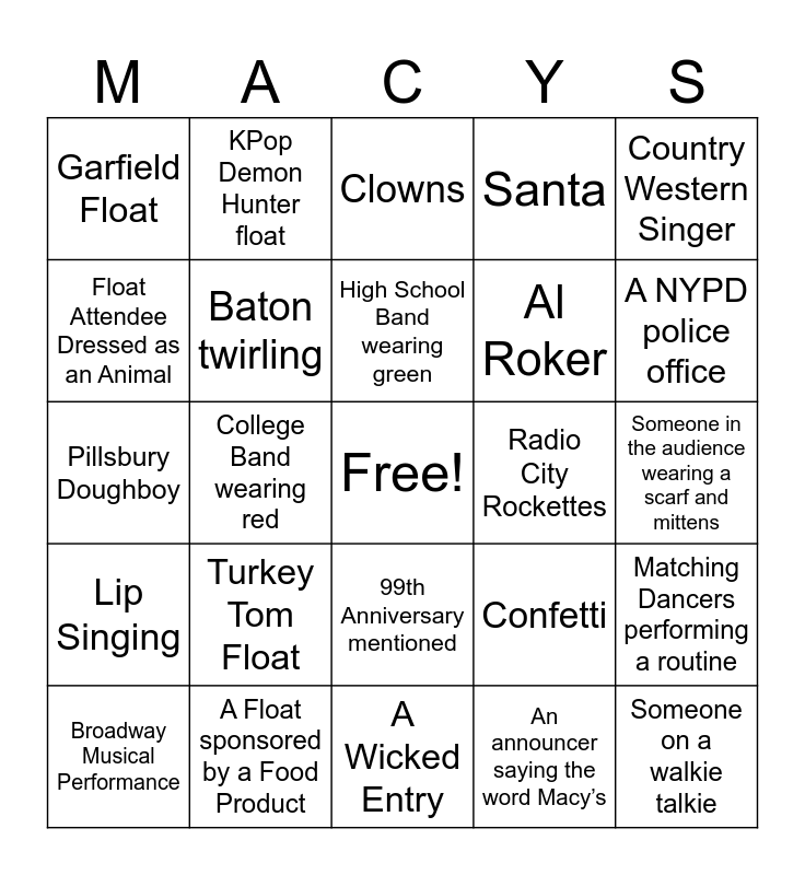 This bingo card has a free space and 25 words: Turkey Tom Float, A Wicked Entry, High School Band wearing green, Broadway Musical Performance, Country Western Singer, Garfield Float, Float Attendee Dressed as an Animal, KPop Demon Hunter float, Radio City Rockettes, 99th Anniversary mentioned, Al Roker, Pillsbury Doughboy, Confetti, Matching Dancers performing a routine, Baton twirling, A tuba, Someone in the audience wearing a scarf and mittens, Clowns, A NYPD police office, College Band wearing red, Someone on a walkie talkie, A Float sponsored by a Food Product, Lip Singing, Santa and An announcer saying the word Macy’s.