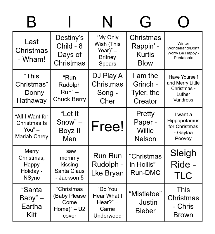 This bingo card has a free space and 24 words: I saw mommy kissing Santa Claus - Jackson 5, “Christmas (Baby Please Come Home)” – U2 cover, DJ Play A Christmas Song - Cher, “Santa Baby” – Eartha Kitt, Winter Wonderland/Don’t Worry Be Happy - Pentatonix, Last Christmas - Wham!, “This Christmas” – Donny Hathaway, Destiny’s Child - 8 Days of Christmas, Pretty Paper - Willie Nelson, Run Run Rudolph - Lke Bryan, I am the Grinch - Tyler, the Creator, “All I Want for Christmas Is You” – Mariah Carey, “Christmas in Hollis” – Run-DMC, Sleigh Ride - TLC, “Run Rudolph Run” – Chuck Berry, “Mistletoe” – Justin Bieber, I want a Hippopotamus for Christmas - Gaylaa Peevey, “My Only Wish (This Year)” – Britney Spears, Have Yourself and Merry Little Christmas - Luther Vandross, “Let It Snow” – Boyz II Men, This Christmas - Chris Brown, Merry Christmas, Happy Holiday - NSync, Christmas Rappin' - Kurtis Blow and “Do You Hear What I Hear?” – Carrie Underwood.