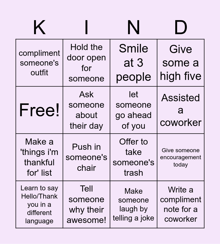 This bingo card has 16 words: Tell someone why their awesome!, Give someone encouragement today, Smile at 3 people, compliment someone's outfit, Make a 'things i'm thankful for' list, Hold the door open for someone, Offer to take someone's trash, Make someone laugh by telling a joke, Free!, Ask someone about their day, Learn to say Hello/Thank you in a different language, Give some a high five, Push in someone's chair, Assisted a coworker, let someone go ahead of you and Write a compliment note for a coworker.