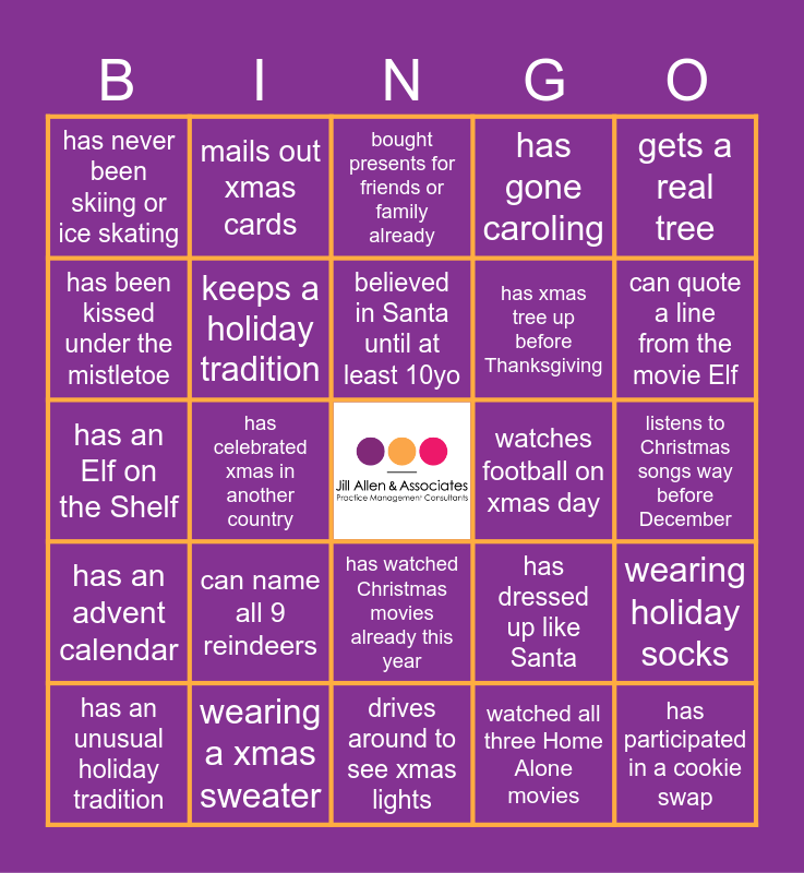 This bingo card has a free space and 24 words: can name all 9 reindeers, wearing a xmas sweater, believed in Santa until at least 10yo, has an unusual holiday tradition, gets a real tree, has never been skiing or ice skating, has been kissed under the mistletoe, mails out xmas cards, watches football on xmas day, has watched Christmas movies already this year, has xmas tree up before Thanksgiving, has an Elf on the Shelf, has dressed up like Santa, wearing holiday socks, keeps a holiday tradition, watched all three Home Alone movies, listens to Christmas songs way before December, bought presents for friends or family already, can quote a line from the movie Elf, has celebrated xmas in another country, has participated in a cookie swap, has an advent calendar, has gone caroling and drives around to see xmas lights.