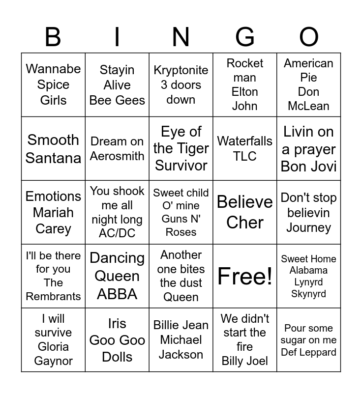 This bingo card has 25 words: Dancing Queen ABBA, Billie Jean Michael Jackson, Eye of the Tiger Survivor, I will survive Gloria Gaynor, American Pie Don McLean, Wannabe Spice Girls, Smooth Santana, Stayin Alive Bee Gees, Believe Cher, Another one bites the dust Queen, Waterfalls TLC, Emotions Mariah Carey, Free!, Sweet Home Alabama Lynyrd Skynyrd, Dream on Aerosmith, Pour some sugar on me Def Leppard, Don't stop believin Journey, Kryptonite 3 doors down, Livin on a prayer Bon Jovi, You shook me all night long AC/DC, Sweet child O' mine Guns N' Roses, Iris Goo Goo Dolls, I'll be there for you The Rembrants, Rocket man Elton John and We didn't start the fire Billy Joel.
