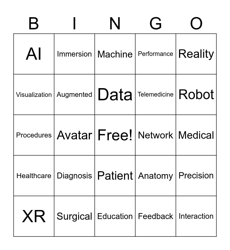 This bingo card has a free space and 34 words: Haptic, Feedback, Simulation, Training, Healthcare, Augmented, Reality, XR, Immersion, Algorithm, Data, Machine, Learning, Neural, Network, Robot, Surgical, Procedures, Diagnosis, Anatomy, Patient, Virtual, AI, Medical, Education, Interaction, Performance, Metrics, Telemedicine, Visualization, Robotics, Avatar, Precision and Scenario.