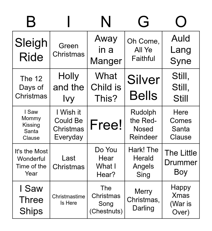 This bingo card has a free space and 85 words: O Come, O Come Emmanuel, Blue Christmas, Away in a Manger, Frosty the Snowman, Go Tell it on the Mountain, Winter Wonderland, Breath of Heaven, Wonderful Christmastime, We Three Kings, Jingle Bells, Baby, It's Cold Outside, Have Yourself a Merry Little Christmas, Holly and the Ivy, Rudolph the Red-Nosed Reindeer, Little Saint Nick, Sleigh Ride, I Saw Three Ships, The 12 Days of Christmas, Another Rock n' Roll Christmas, Deck the Halls, O Christmas Tree, Silver Bells, Happy Xmas (War is Over), Christmas (Baby, Please Come Home), I Wish it Could Be Christmas Everyday, Up On the Housetop, Joy to the World, A Holly Jolly Christmas, Run Rudolph Run, Mele Kalikimaka, Last Christmas, Mistletoe and Holly, Step Into Christmas, I Saw Mommy Kissing Santa Clause, Let it Snow!, Silver and Gold, The Christmas Song (Chestnuts), Feliz Navidad, It's the Most Wonderful Time of the Year, Still, Still, Still, You're a Mean One, Mr. Grinch, Christmas Don't Be Late, Do They Know It's Christmas?, Silent Night, Where Are You Christmas?, Mary, Did You Know?, God Rest Ye Merry Gentlemen, We Wish You a Merry Christmas, Someday at Christmas, Santa Baby, Green Christmas, What Child is This?, Pretty Paper, Carol of the Bells, Dance of the Sugarplum Fairies, White Christmas, Christmastime Is Here, Oh Come, All Ye Faithful, It's Beginning to Look a Lot Like Christmas, Rockin' Around the Christmas Tree, We Need a Little Christmas, O Holy Night, Jingle Bell Rock, Santa Clause is Comin' To Town, Christmas Wrapping, Auld Lang Syne, I'll Be Home for Christmas, The Little Drummer Boy, Christmas Canon, All I Want for Christmas Is You, O Little Town of Bethlehem, The First Noel, Holiday Road, I Heard the Bells on Christmas Day, Grandma Got Run Over By a Reindeer, Do You Hear What I Hear?, Merry Christmas, Darling, Merry Christmas, Baby, It Came Upon a Midnight Clear, Please Come Home For Christmas, Here Comes Santa Clause, Home for the Holidays, Angels We Have Heard On High, Hark! The Herald Angels Sing and Happy Holiday.