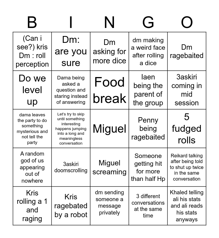 This bingo card has a free space and 24 words: 3askiri doomscrolling, Kris ragebated by a robot, Food break, Kris rolling a 1 and raging, Dm ragebaited, (Can i see?) kris Dm : roll perception, Do we level up, Dm: are you sure, Penny being ragebaited, Miguel screaming, Iaen being the parent of the group, dama leaves the party to do something mysterious and not tell the party, Someone getting hit for more than half Hp, Reikard talking after being told to shut up twice in the same conversation, Dama being asked a question and staring instead of answering, 3 different conversations at the same time, 5 fudged rolls, Dm asking for more dice, 3askiri coming in mid session, Let’s try to skip until something interesting happens jumping into a long and meaningless conversation, Khaled telling ali his stats and ali reads his stats anyways, A random god of us appearing out of nowhere, dm making a weird face after rolling a dice and dm sending someone a message privately.
