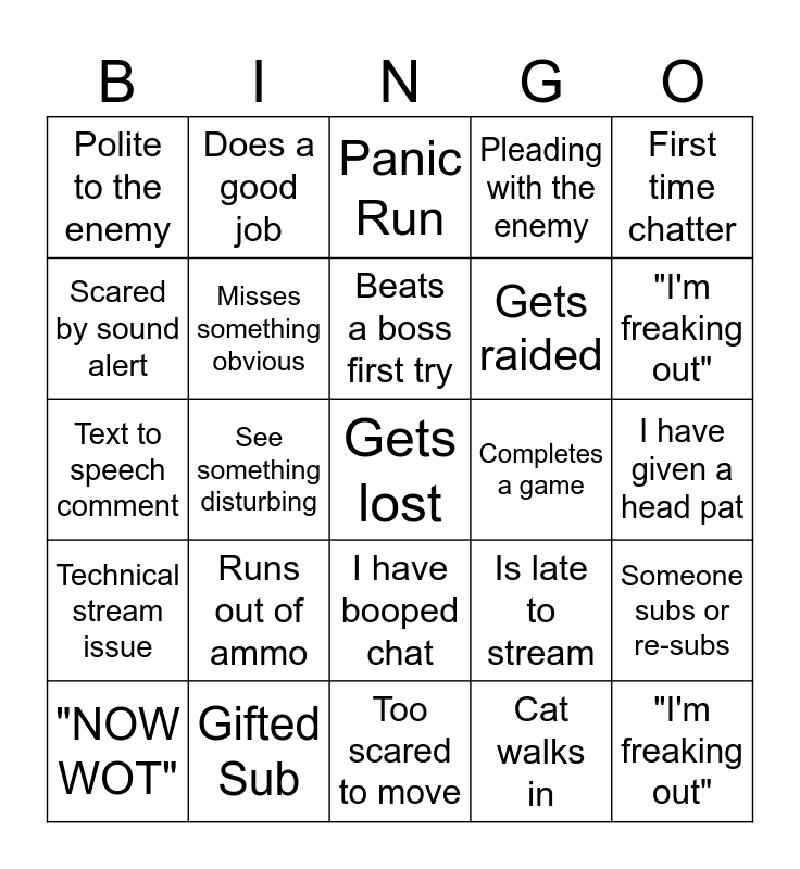 This bingo card has a free space and 24 words: Runs out of ammo, Gifted Sub, Beats a boss first try, "NOW WOT", First time chatter, Polite to the enemy, Scared by sound alert, Does a good job, Completes a game, I have booped chat, Gets raided, Text to speech comment, Is late to stream, Someone subs or re-subs, Misses something obvious, Cat walks in, I have given a head pat, Panic Run, "I'm freaking out", See something disturbing, "I'm freaking out", Technical stream issue, Pleading with the enemy and Too scared to move.